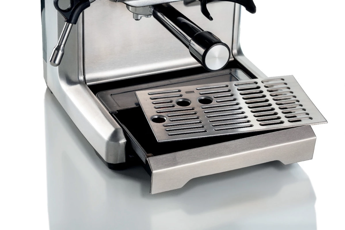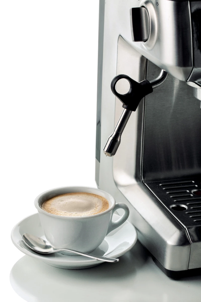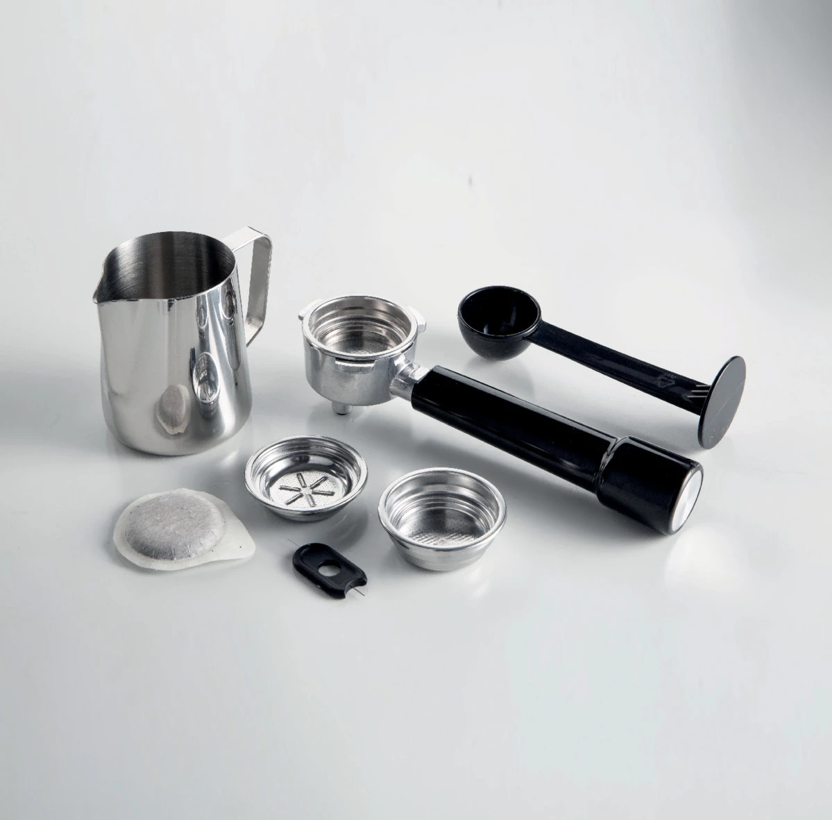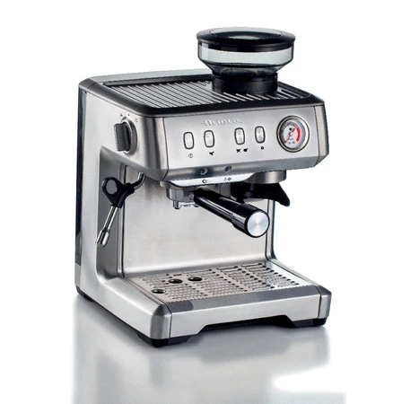 Kolbowy ekspres ciśnieniowy do parzenia kawy mielonej i z podsów E.S.E., moc 1600 W, ciśnienie 15 BAR, programator ilości parzonej kawy dla pojedynczego i podwójnego espresso, funkcja ThermoCream Perfect Crema, funkcja shut off (po 30 min), sygnalizacja o potrzebie odkamienienia, pasywne podgrzewanie filiżanek, korpus ze stali nierdzewnej, elektrozawór, wbudowany stalowy żarnowy młynek do kawy z pokrętłem regulacji i dyspenserem Press & Go, parowy spieniacz do mleka Maxi Cappuccino, antypoślizgowe nóżki, wyjmowana tacka, filtr wody, metalowa profesjonalna kolba, dwa wymienne sitka o średnicy 58 mm do dużego i małego espresso oraz podsów E.S.E, łyżka z miarką i tamperem, metalowy dzbanek do spienienia mleka, wyjmowany zbiornik na wodę o pojemności 2 l, wymiary 28x30,5x39,5 cm
