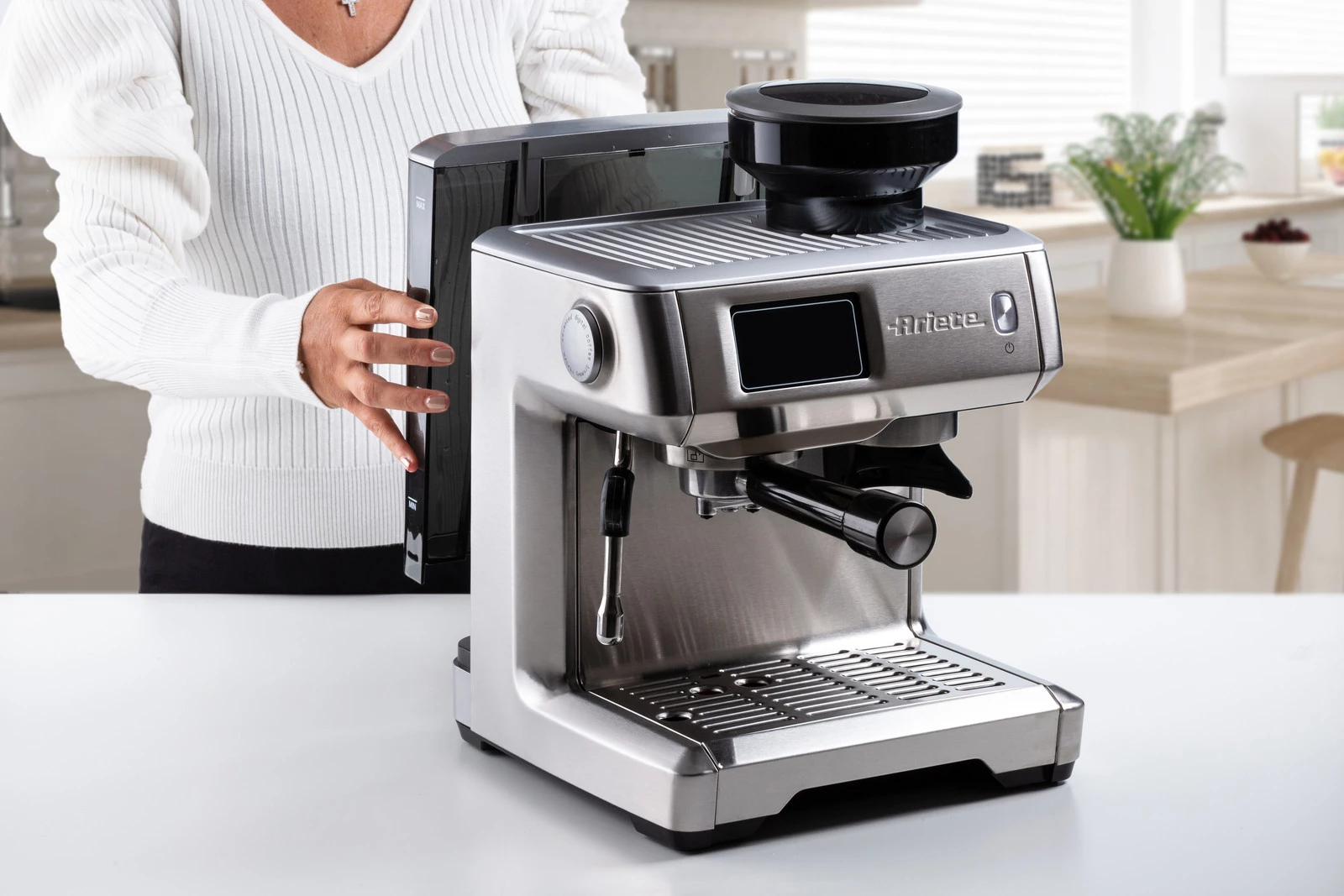Kolbowy ekspres ciśnieniowy do parzenia kawy mielonej i z podsów E.S.E., moc 1600 W, 4'' wyświetlacz TFT, ciśnienie 15 BAR, 14 programów parzenia + ustawienia preferencji, funkcje konserwacji urządzenia (czyszczenie, odkamienianie), funkcja ThermoCream Perfect Crema, funkcja shut off (po 30 min), sygnalizacja o potrzebie odkamienienia, pasywne podgrzewanie filiżanek, korpus ze stali nierdzewnej, podwójny elektrozawór, wbudowany stalowy żarnowy młynek do kawy z pokrętłem regulacji i funkcją automatycznego dozowania ilości, parowy spieniacz do mleka Maxi Cappuccino z funkcją automatycznego zatrzymania procesu, antypoślizgowe nóżki, wyjmowana tacka, filtr wody, metalowa kolba, 5 wymiennych sitek do dużego i małego espresso oraz podsów E.S.E, łyżka z miarką i tamperem, metalowy dzbanek do spienienia mleka, zbiornik na kawę o pojemności 220 g, wyjmowany zbiornik na wodę o pojemności 2 l, wymiary 30,5x28x39,5 cm