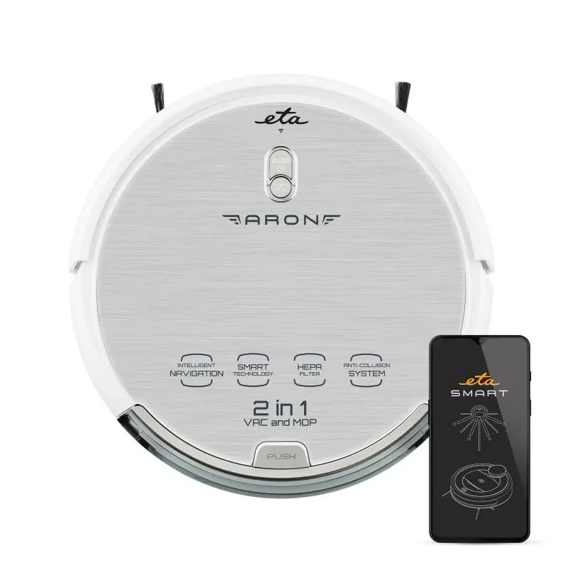 ETA Aron 351290000 to robot sprzątający przeznaczony do codziennego odkurzania i mopowania podłóg twardych oraz dywanów o niskim runie.