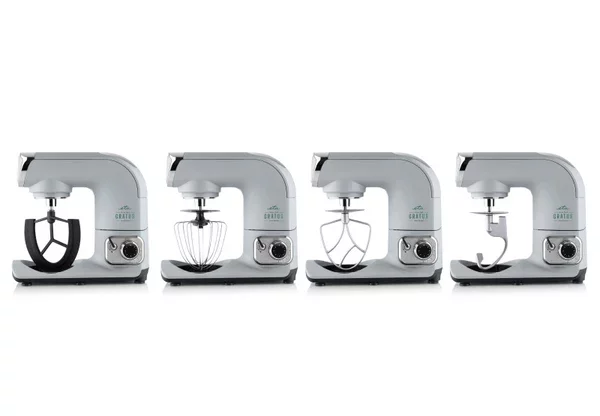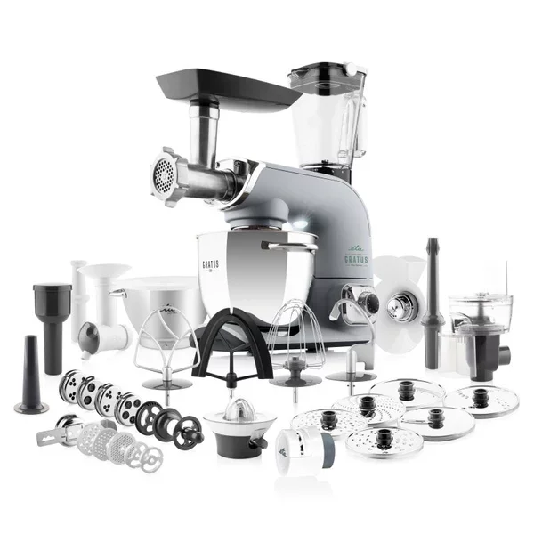 • Moc [W]: 1500 | Pojemność misy [l]: 5,5 i 3,5 | 4 mieszadła, | Maszynka do mielenia mięsa, blender kielichowy, ostrzałka do noży, wykrojniki do makaronu, wyciskarka do cytrusów, młynek do maku, przystawka do lodów | możliwość rozbudowy | Kolor: szary