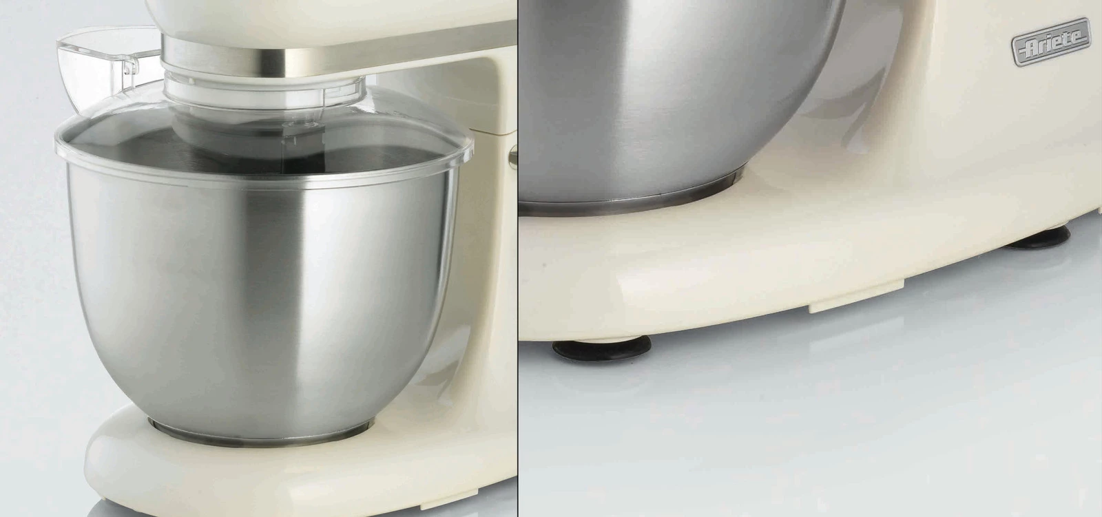 Dodatkowo robot marki Ariete jest prosty w rozłożeniu i czyszczeniu. Wyposażony w osłonę przed chlapaniem ze specjalnym otworem do dodawania składników oraz mocne przyssawki, które zabezpieczają urządzenie przed przesuwaniem po blacie podczas pracy.